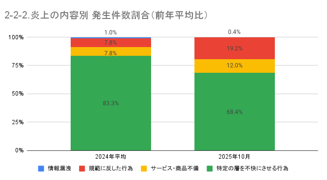 割合については下図のとおり「情報漏洩」が1.1ポイントの減少、「規範に反した行為」が2.2ポイントの減少、「サービス・商品不備」が5.3ポイントの減少、「特定の層を不快にさせる行為」が8.7ポイントの増加という結果でした。