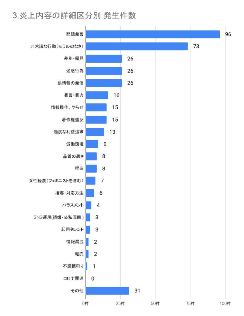 炎上内容の詳細を分析したところ、「問題発言」に関する炎上事案が96件と最も多く、次いで「非常識な行動(モラルのなさ)」に関する炎上事案が73件でした。