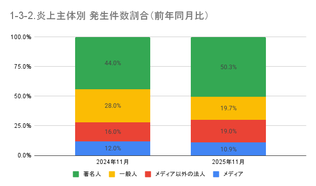 割合については下図のとおり、前年同月と比較し、「著名人」が6.3ポイントの増加、「一般人」が8.3ポイントの減少、「メディア以外の法人」が3ポイントの増加、「メディア」が1.1ポイントの減少という結果でした。