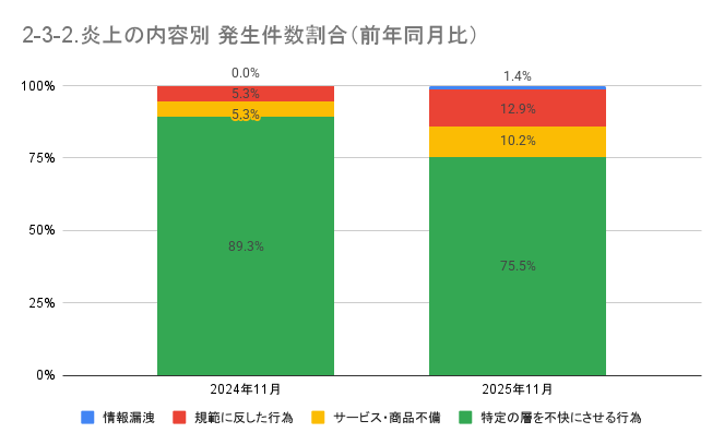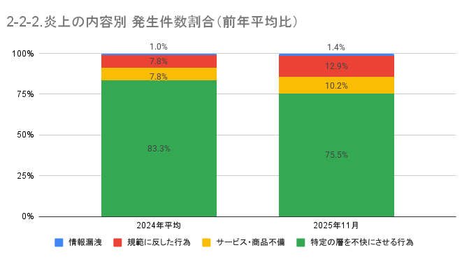 割合については下図のとおり「情報漏洩」が1.ポイントの増加、「規範に反した行為」が6.3ポイントの減少、「サービス・商品不備」が1.8ポイントの減少、「特定の層を不快にさせる行為」が7.1ポイントの増加という結果でした。