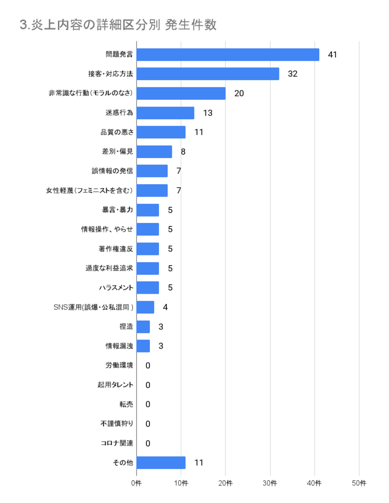 炎上内容の詳細を分析したところ、「問題発言」に関する炎上事案が41件と最も多く、次いで「接客・対応方法」に関する炎上事案が32件でした。