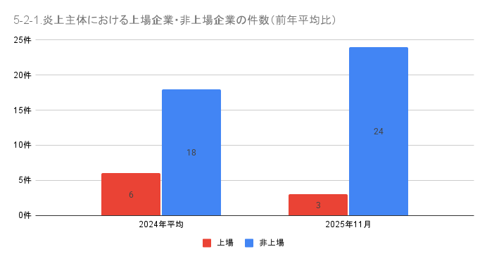前年平均と比較すると、「上場企業」の件数は3件減少、「非上場企業」の件数は6件増加しました。