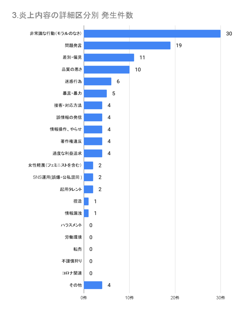 炎上内容の詳細を分析したところ、「非常識な行動(モラルのなさ)」に関する炎上事案が30件と最も多く、次いで「問題発言」に関する炎上事案が19件でした。