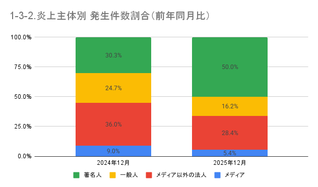 割合については下図のとおり、前年平均と比較すると、「著名人」が12.7ポイントの増加、「一般人」が12.2ポイントの減少、「メディア以外の法人」が2.9ポイントの増加、「メディア」が3.4ポイントの減少という結果でした。