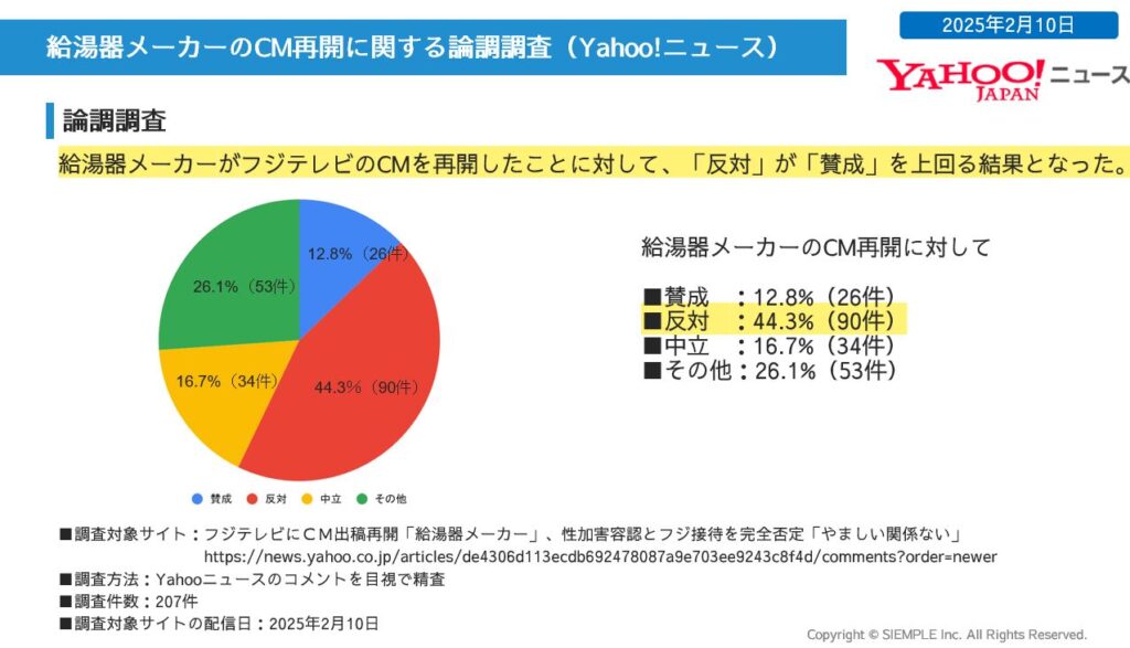 こうした論調の強まりを受け、トヨタ自動車などの大手企業はフジテレビでのCM差し止めを続々と発表しました。SNS上では賛同の声が多く見られたと同時に、差し止めていない企業への批判が強まることとなりました。