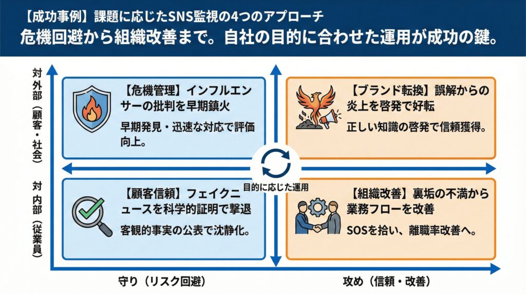 ここまで、SNS監視を活用した4つの成功事例を見てきました。
