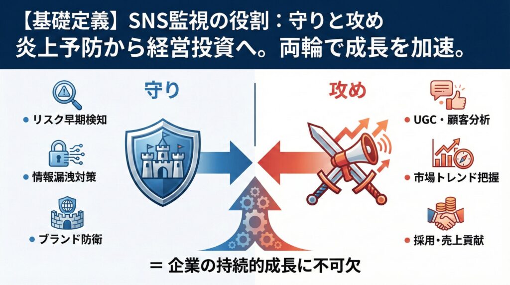 現代の企業経営において、SNS監視は、「守り(リスク回避)」と「攻め(マーケティング)」の両輪を回すための必須ツールへと進化しています。