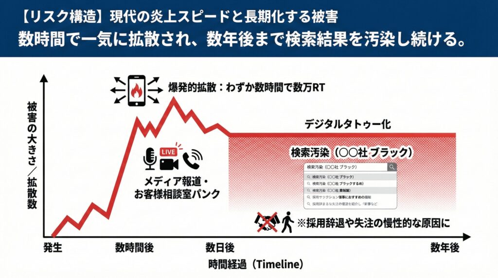 SNS監視が不可欠になった最大の理由は、「炎上の拡散スピード」が劇的に上がったからです。