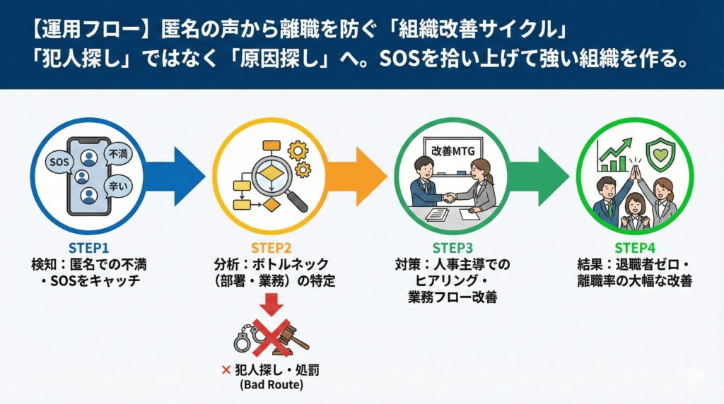 投稿内容から「どの部署で、何がボトルネックになっているか」を分析し、人事部主導で該当部署の面談を実施。不満の原因となっていた業務フローの改善を行いました。