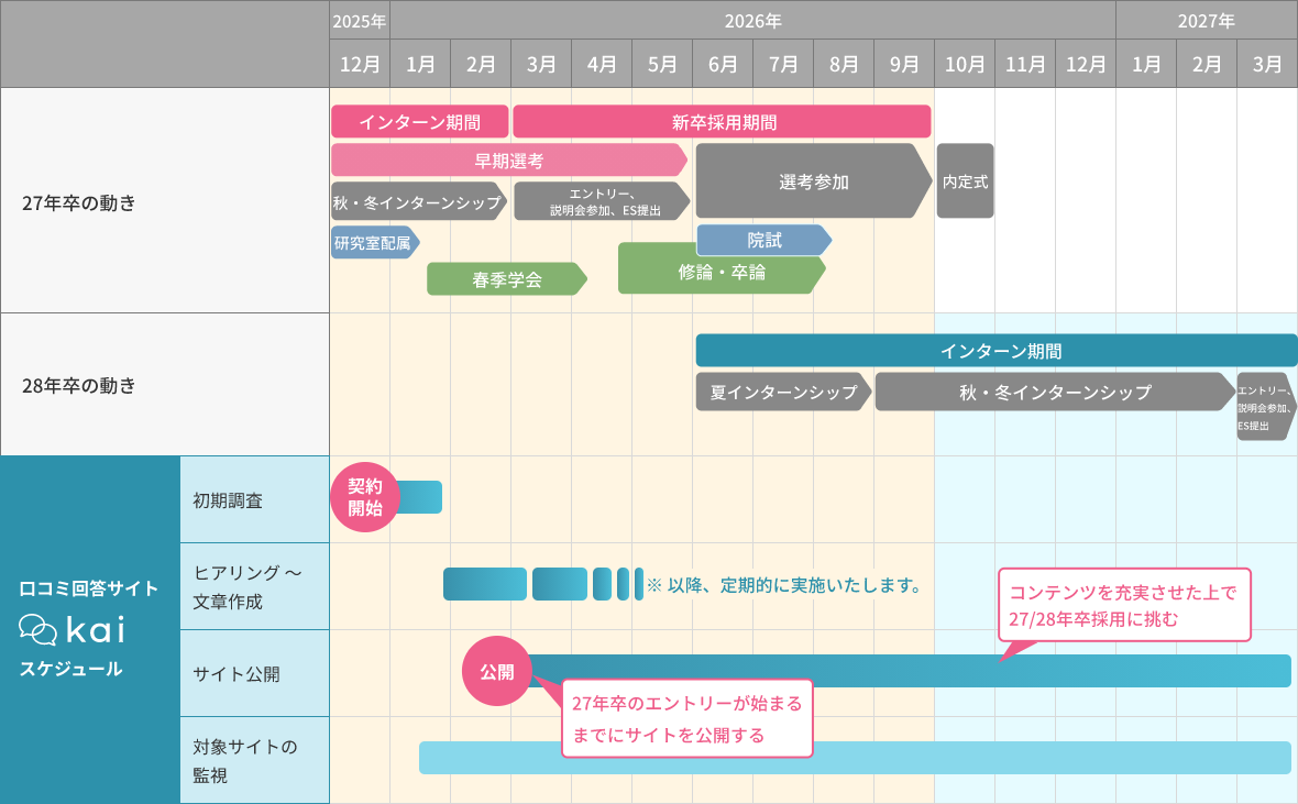 SEO対策全社共通ドメイン(Kai-z.net)での運用のためコンテンツ量が多く、高いSEO効果が期待できます。毎月新たにコンテンツを公開しながら、貴社名に「口コミ」や「評判」等を加えて検索した際に、『Kai』が上位表示される環境を作ります。