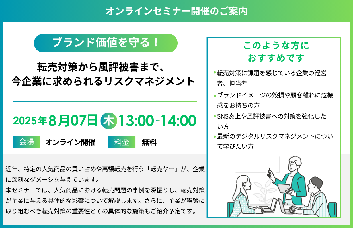 開催日時:2025.08.07 『ブランド価値を守る!転売対策から風評被害まで、今企業に求められるリスクマネジメント』 セミナー開催のお知らせ